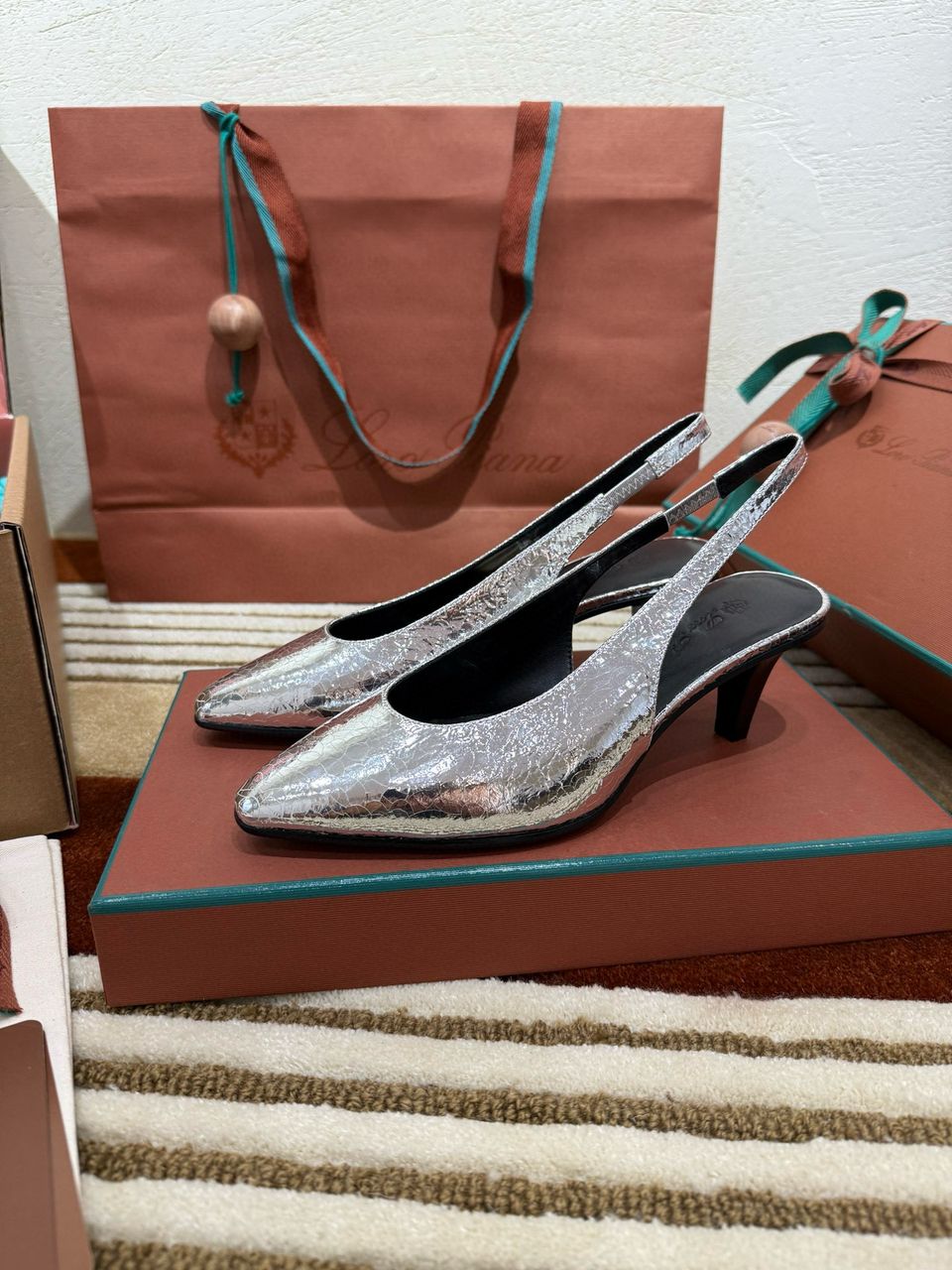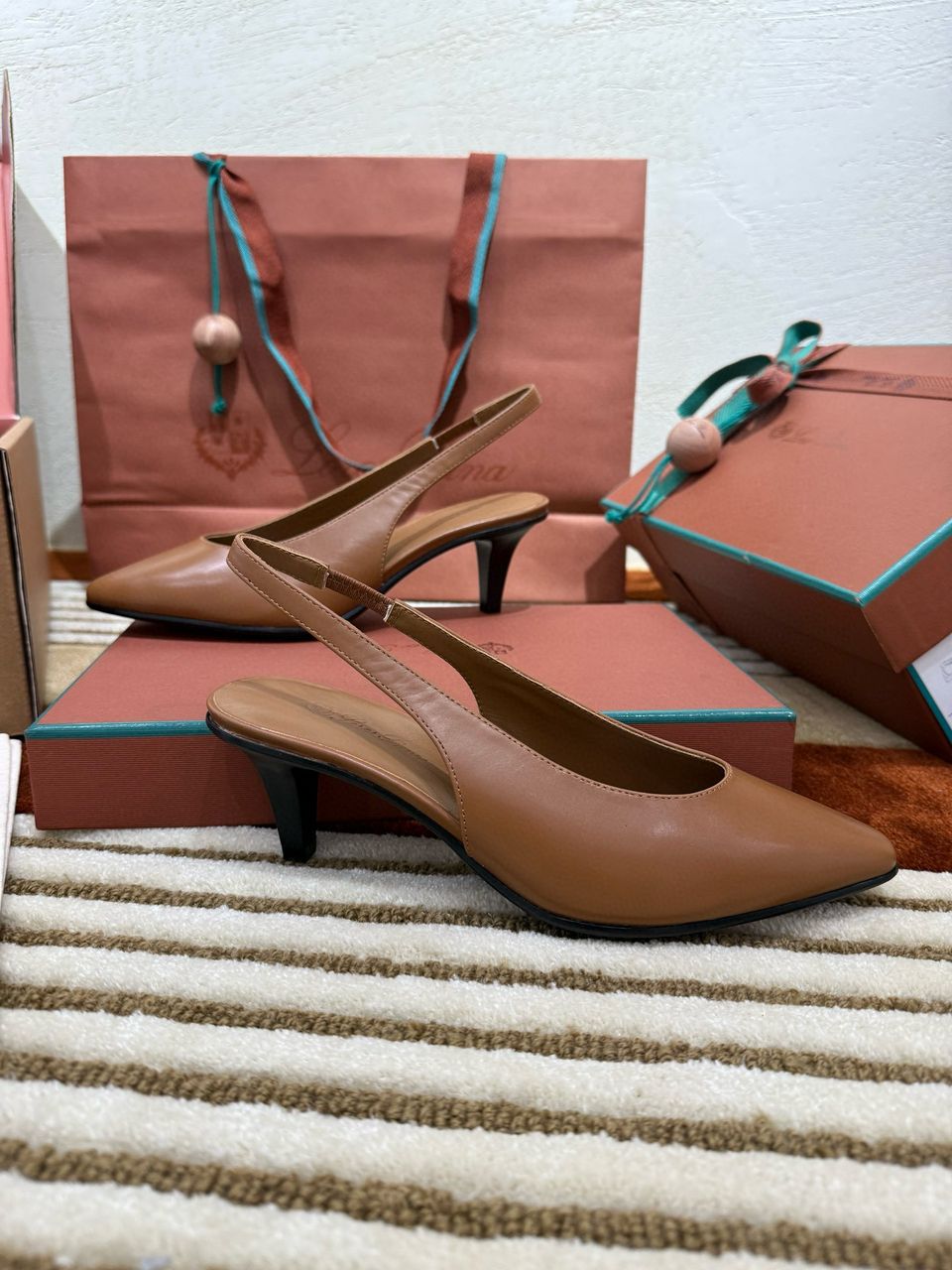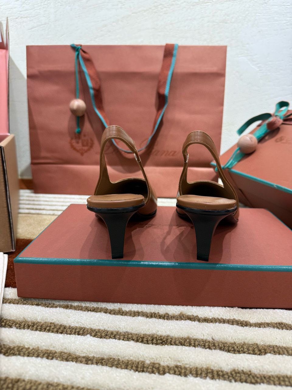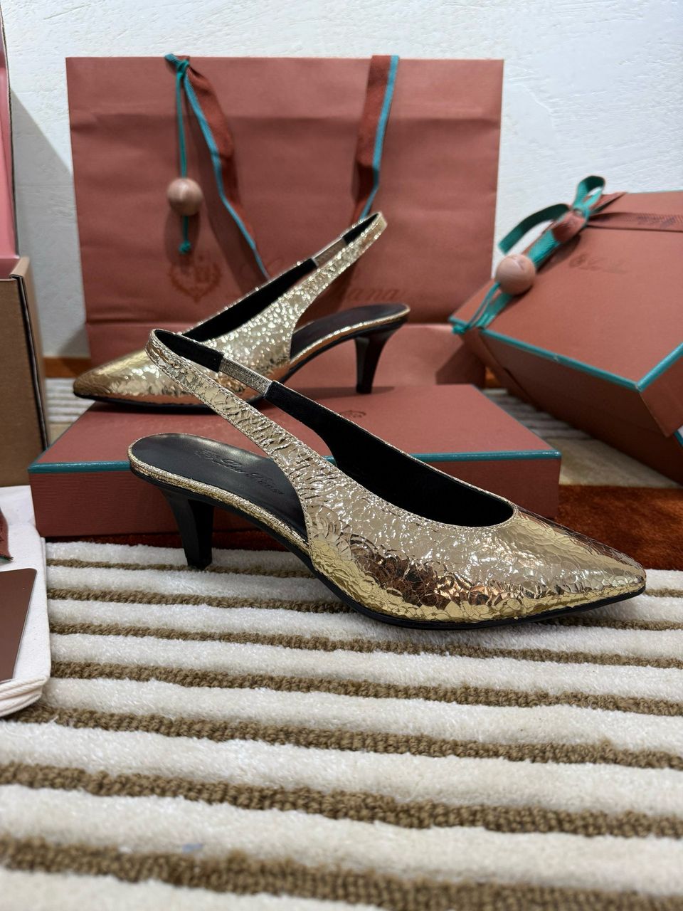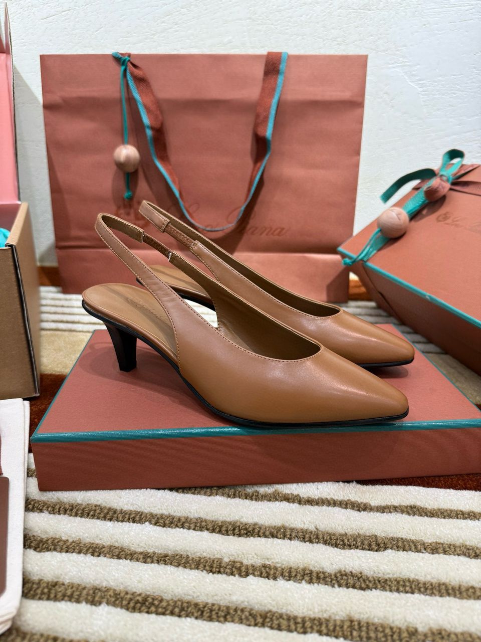 These slingbacks are part of the Rebecca line, defined by soft contours and pointy toes. They are crafted from calfskin with a unique finish, making them extremely soft while preserving the natural qualities of the leather. Their slightly lived-in look adds a touch of sophisticated elegance, while their versatile, feminine style makes them perfect in casual-chic outfits.