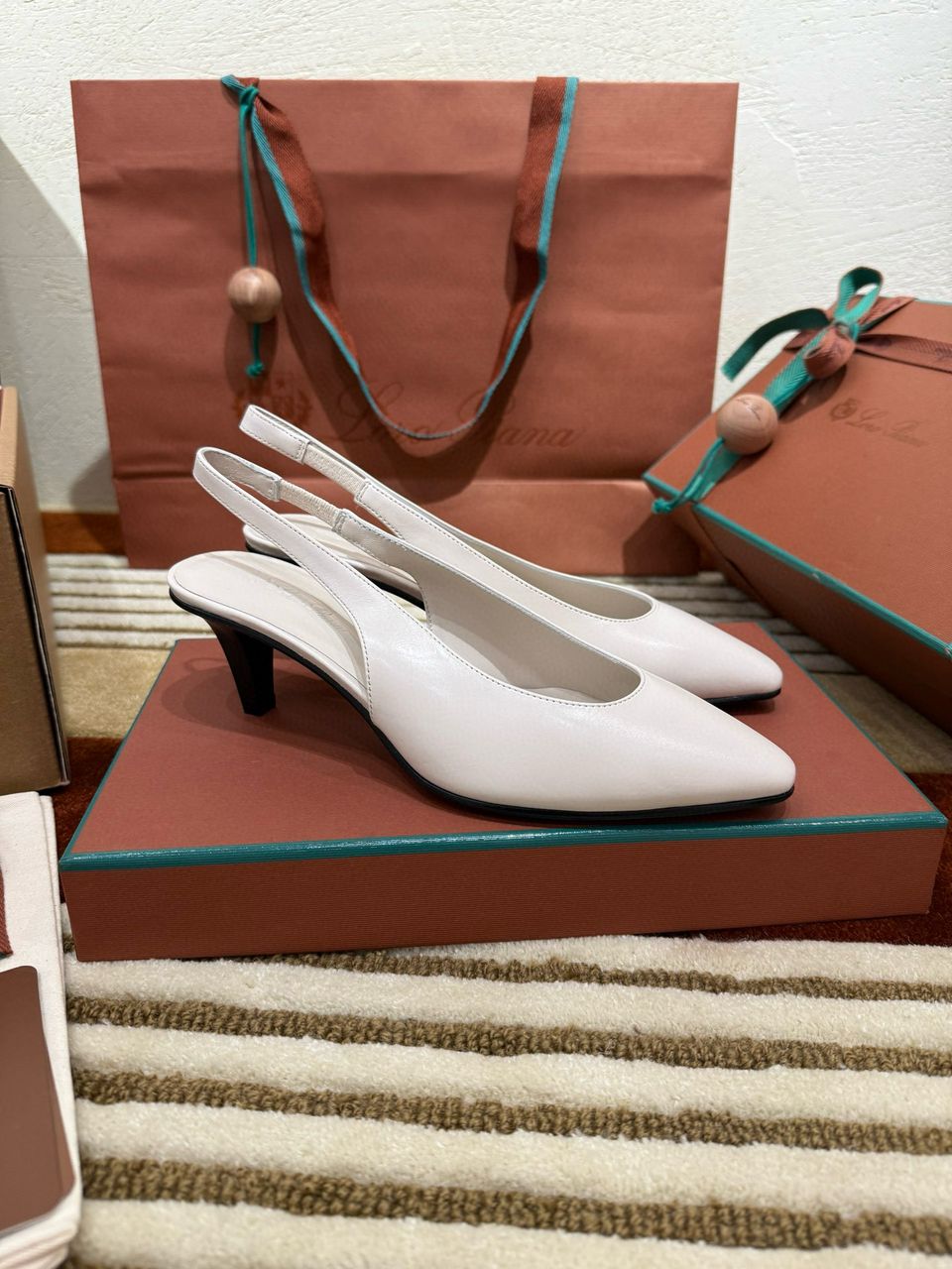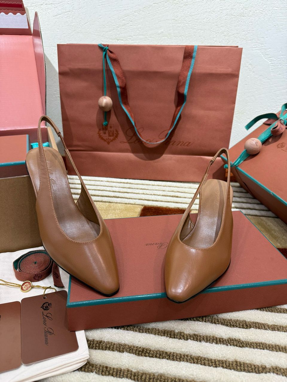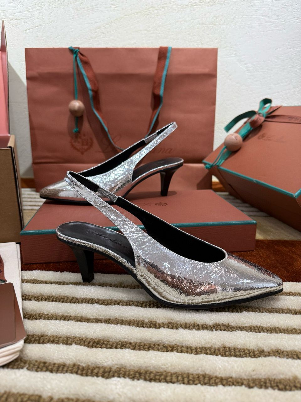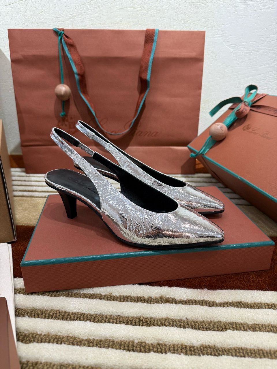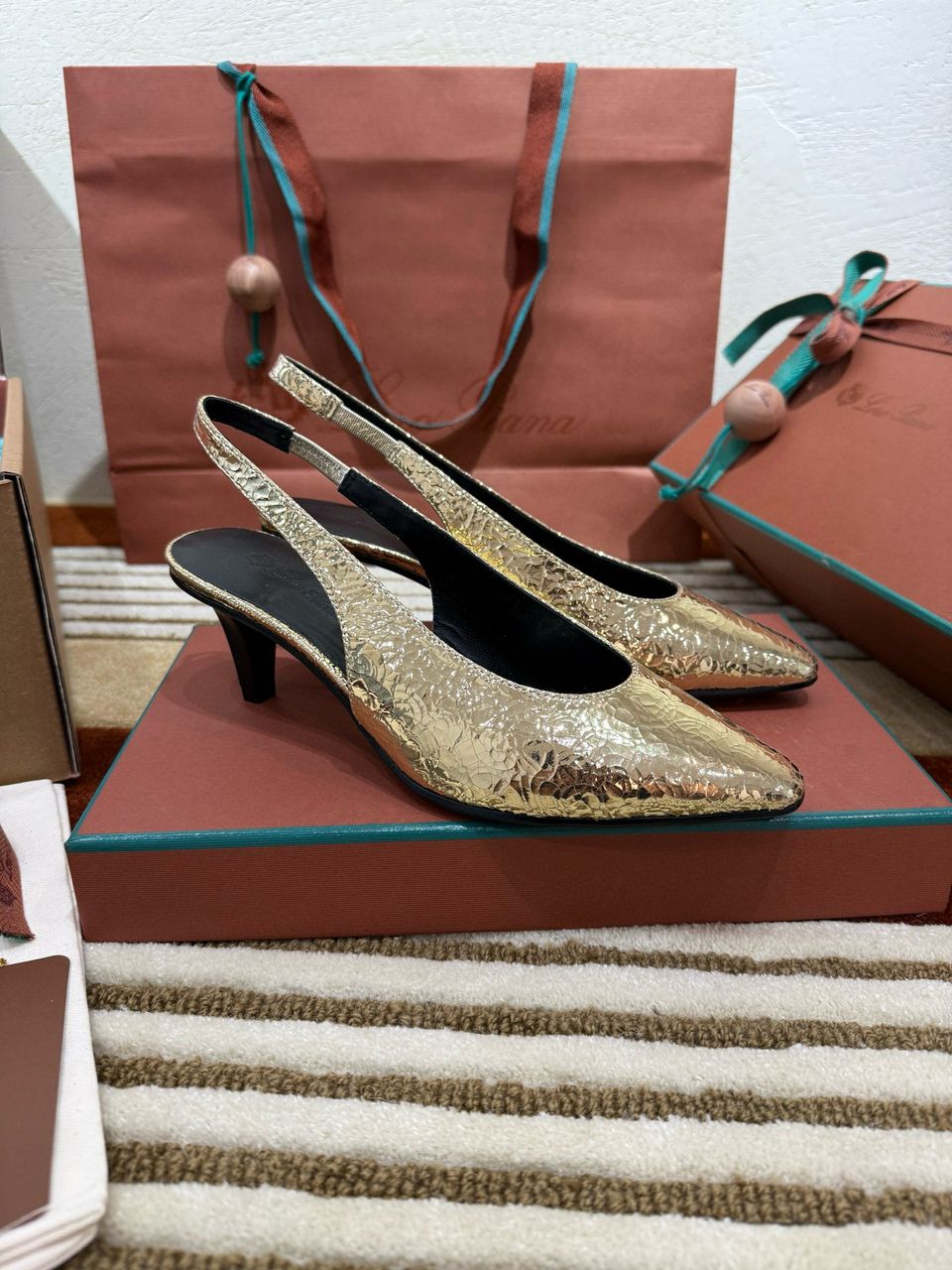 These slingbacks are part of the Rebecca line, defined by soft contours and pointy toes. They are crafted from calfskin with a unique finish, making them extremely soft while preserving the natural qualities of the leather. Their slightly lived-in look adds a touch of sophisticated elegance, while their versatile, feminine style makes them perfect in casual-chic outfits.
