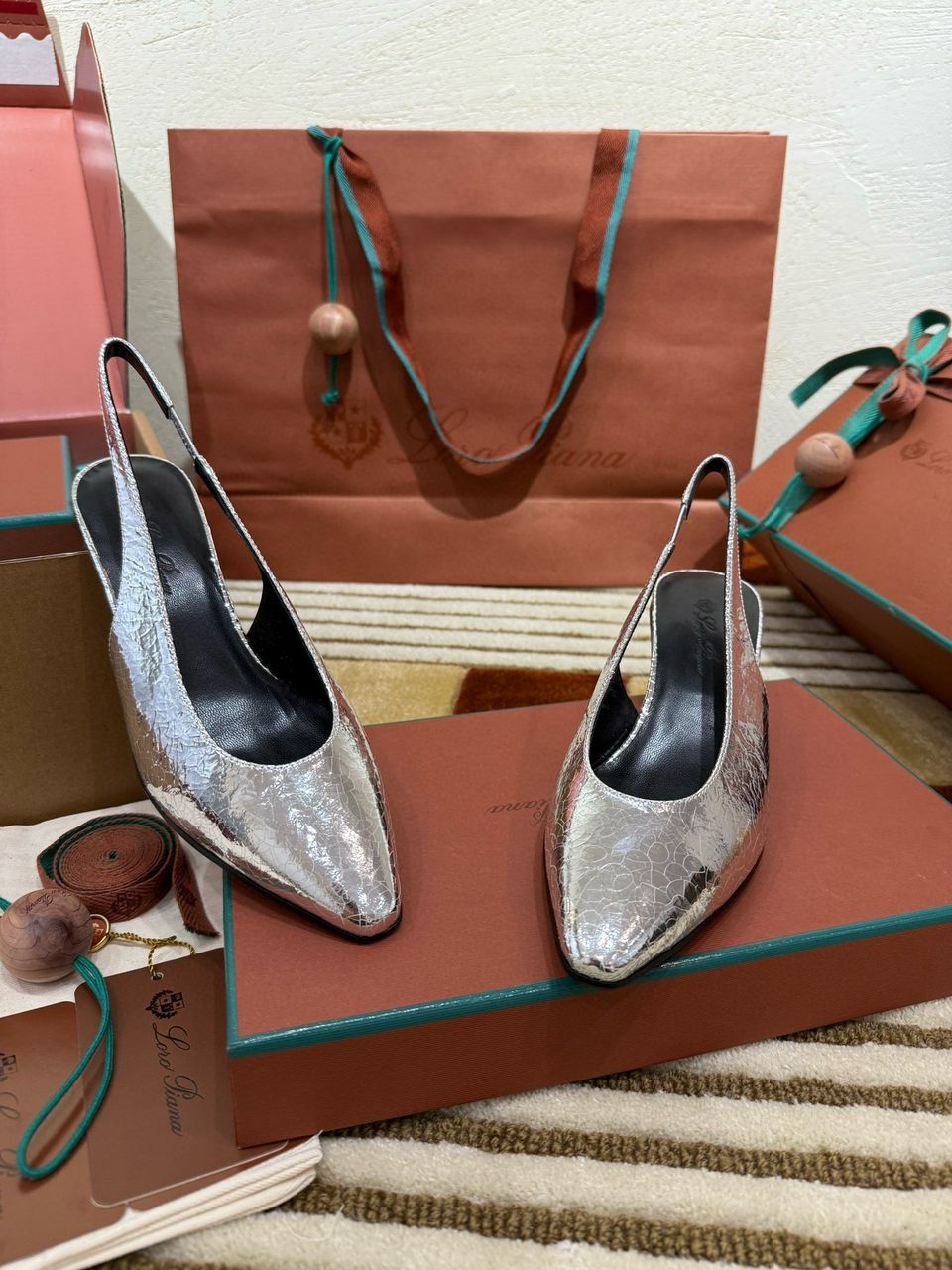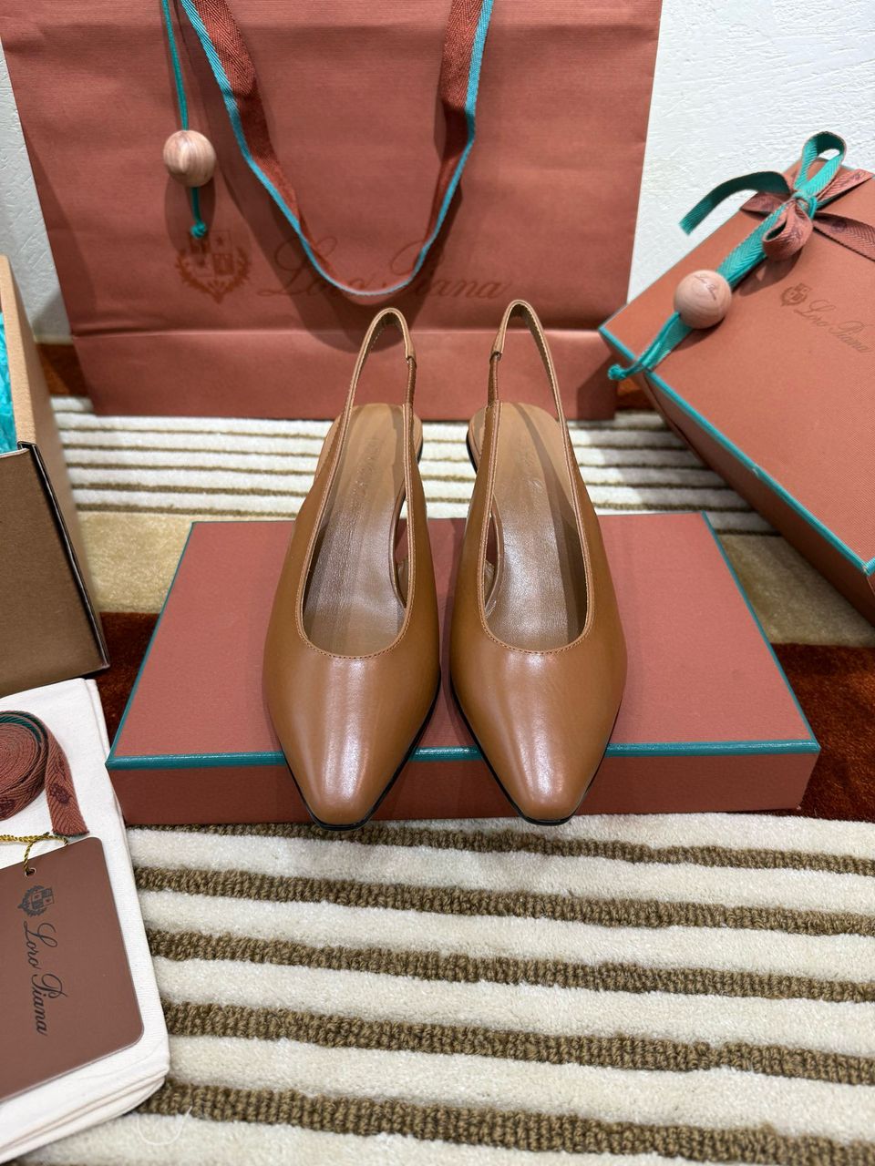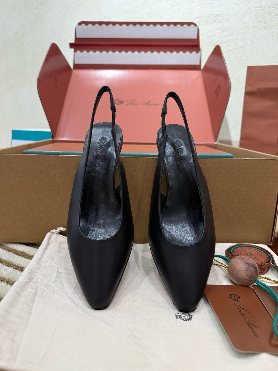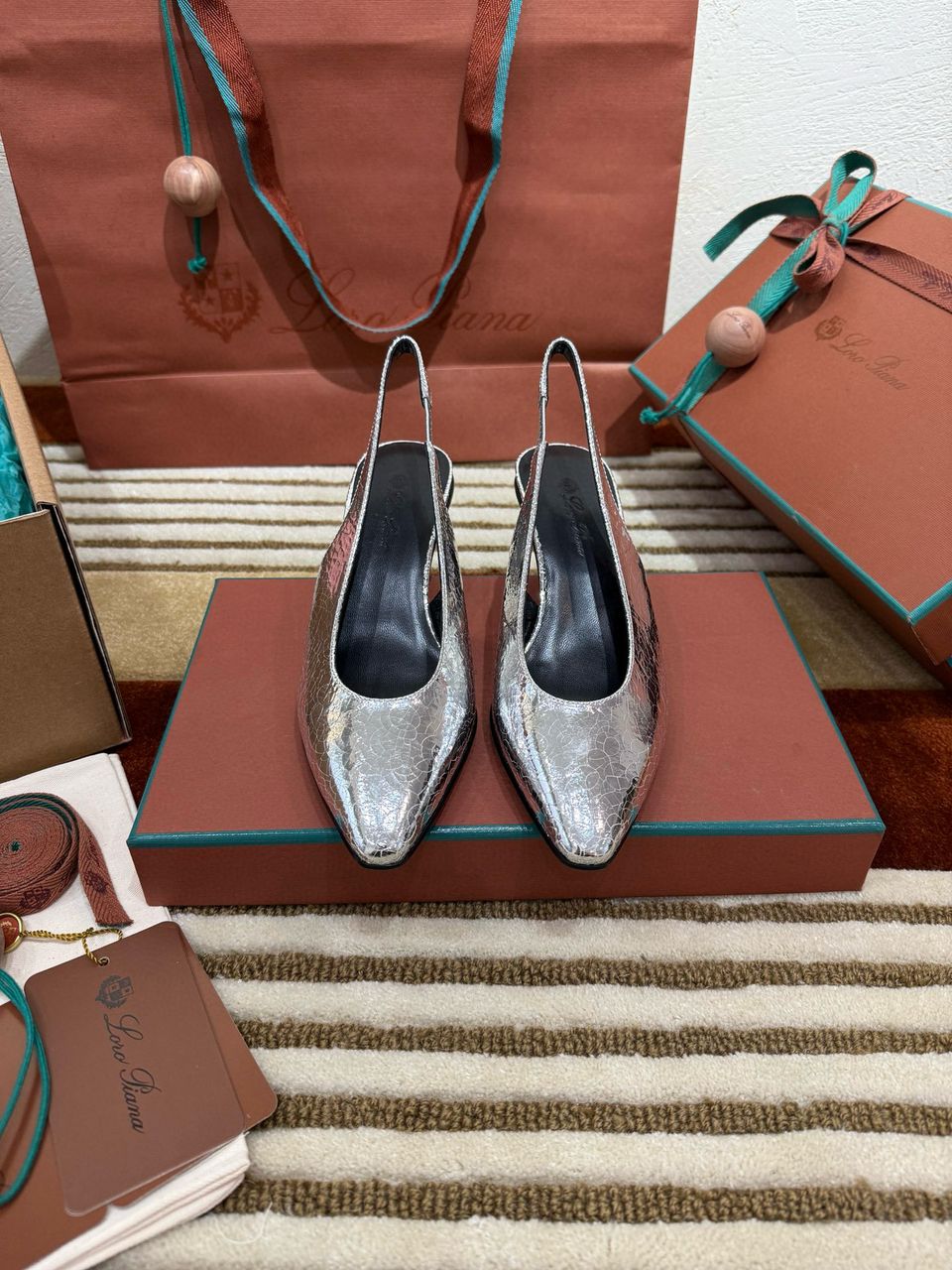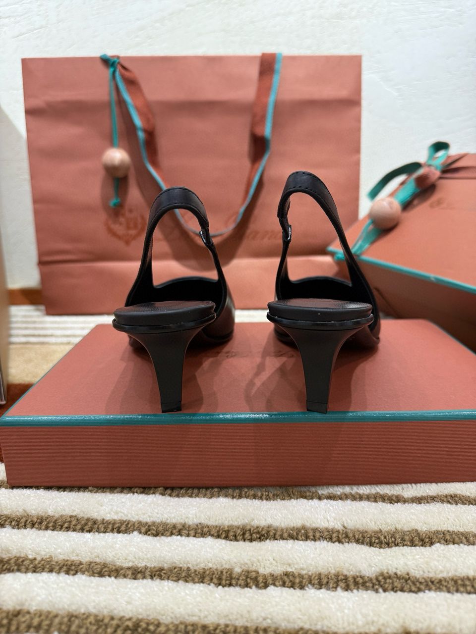 These slingbacks are part of the Rebecca line, defined by soft contours and pointy toes. They are crafted from calfskin with a unique finish, making them extremely soft while preserving the natural qualities of the leather. Their slightly lived-in look adds a touch of sophisticated elegance, while their versatile, feminine style makes them perfect in casual-chic outfits.