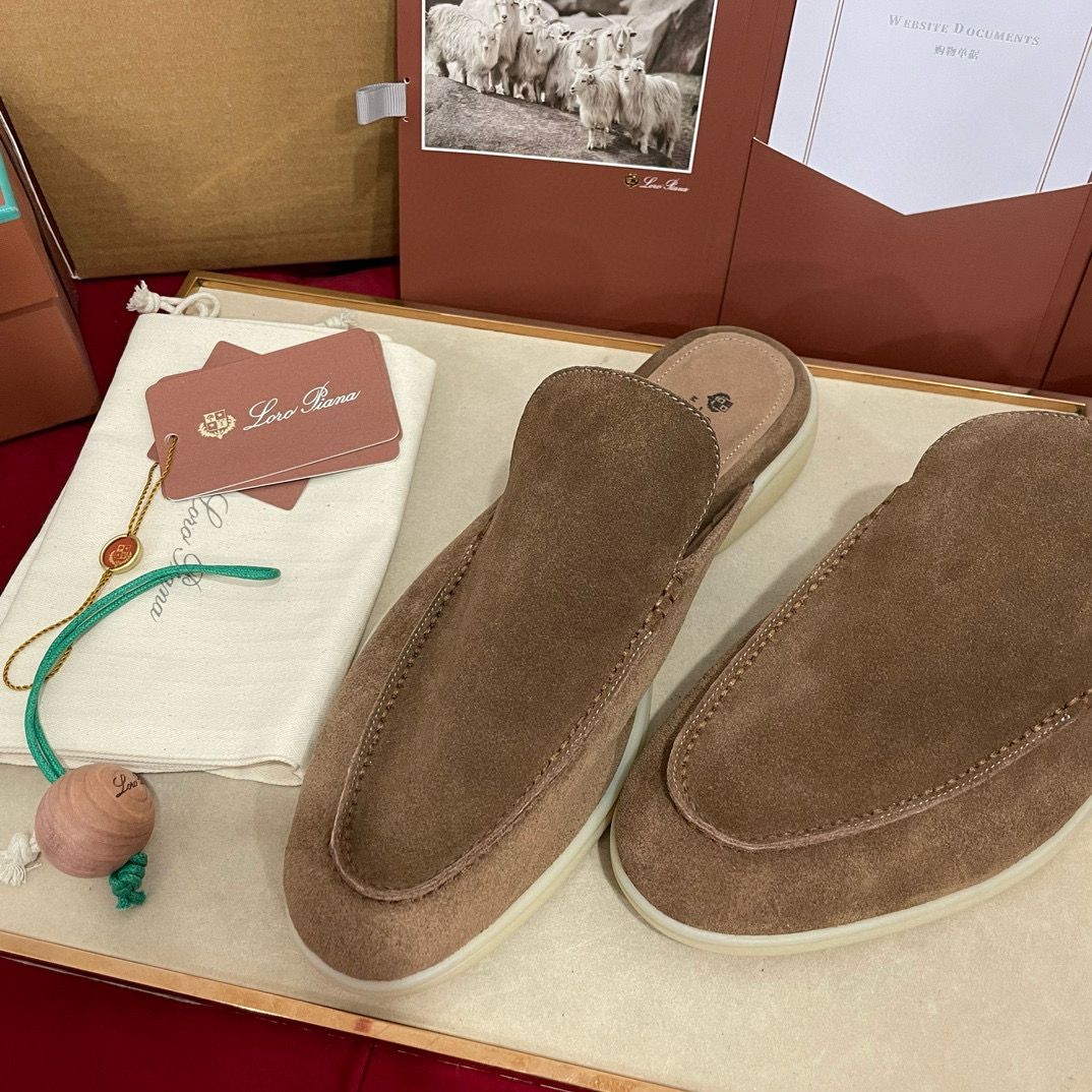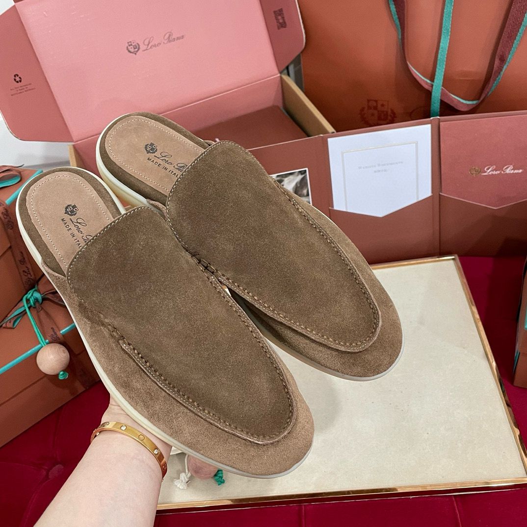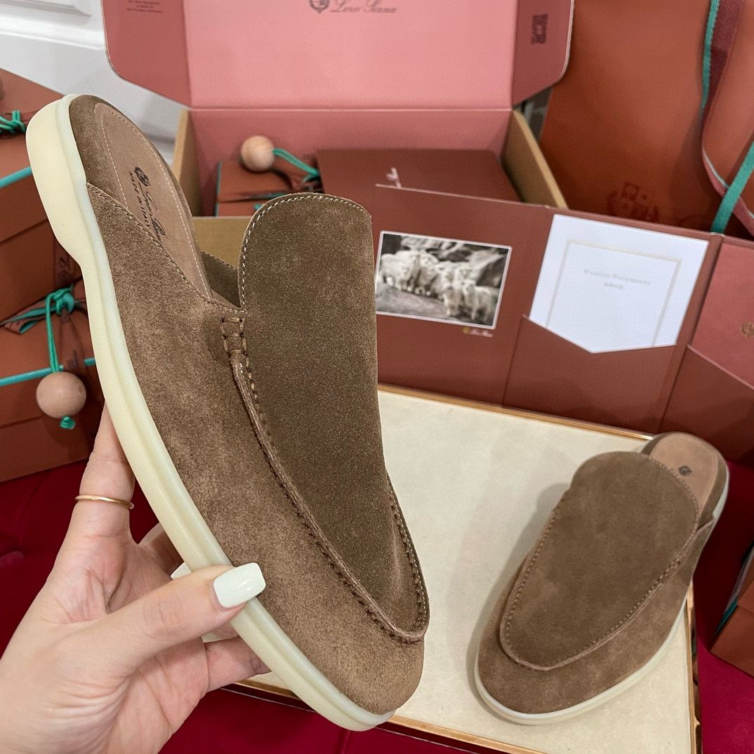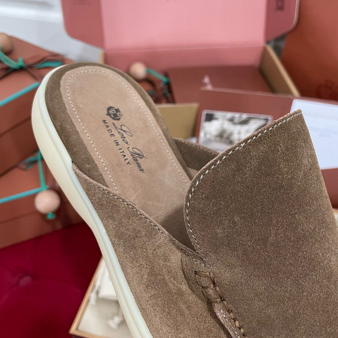Slipper version of the iconic Summer Walk loafer made from unlined suede. They feature a dedicated space on the heels where you can write your name — a hallmark feature of Loro Piana’s sportswear shoes, inspired by the world of sailing.