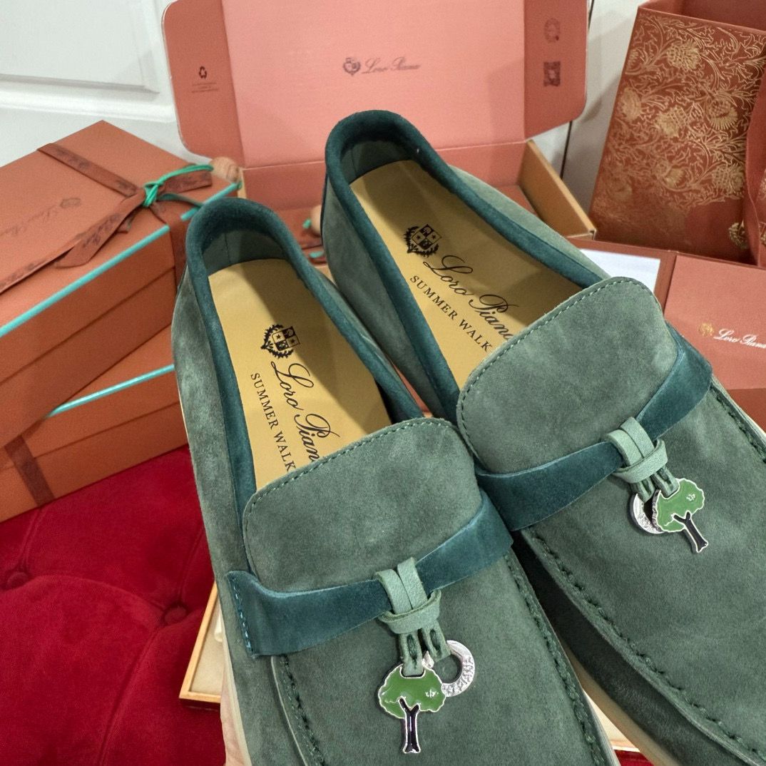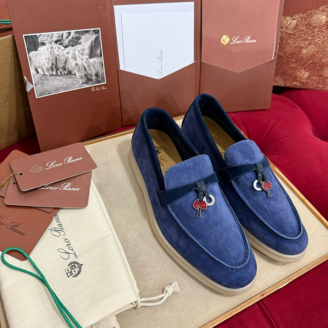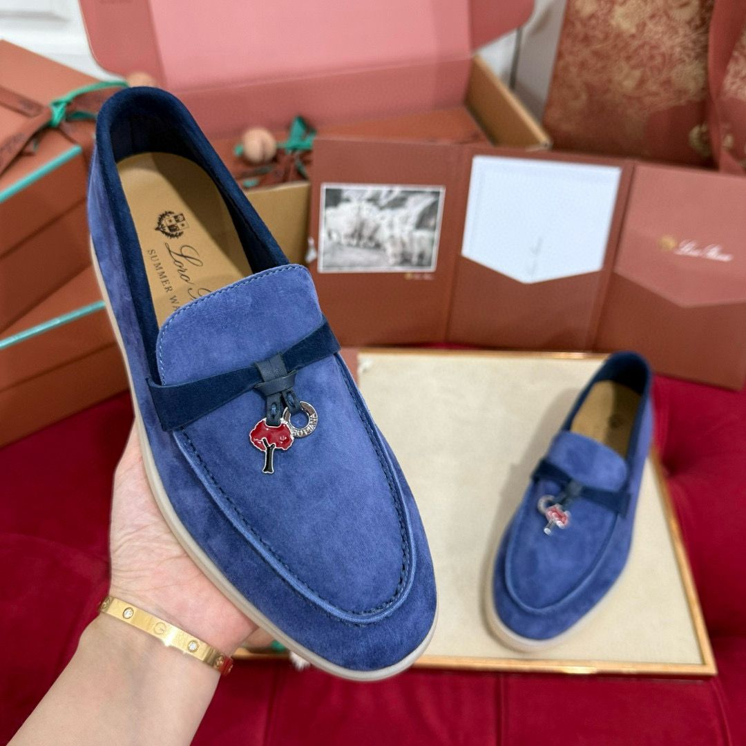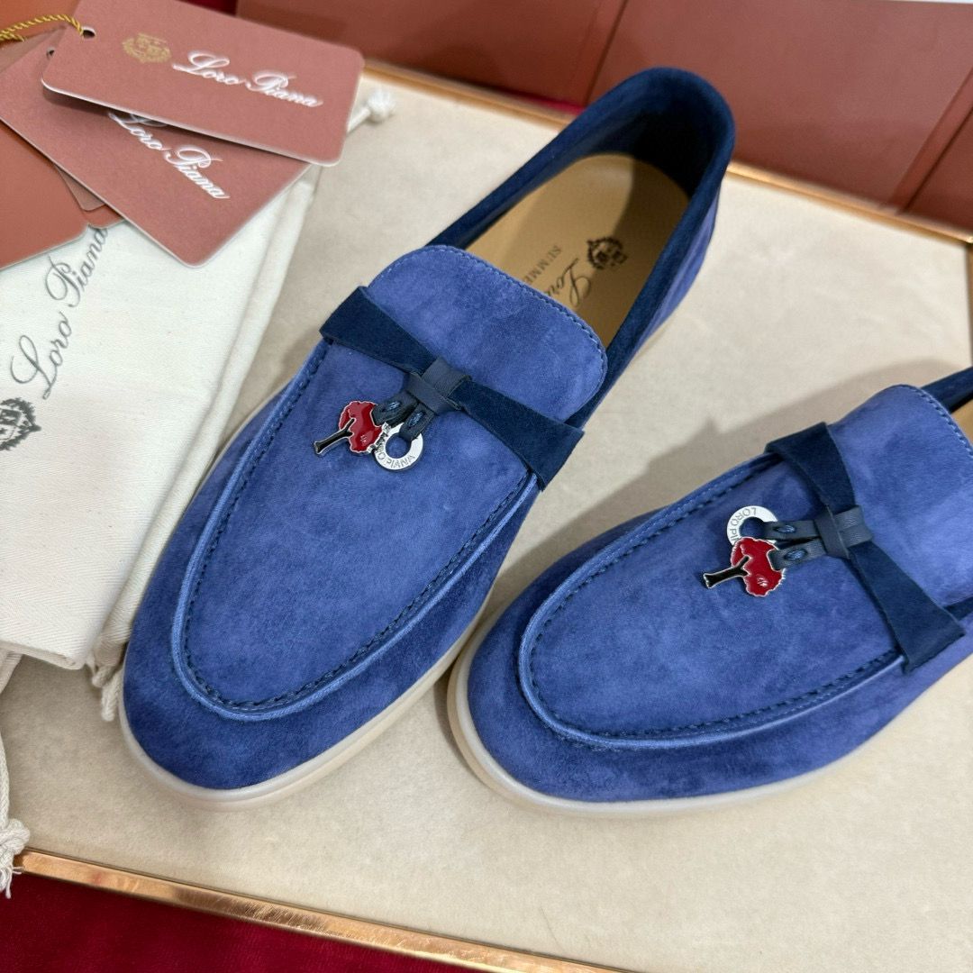 Iconic suede loafers. They feature soft nappa leather piping and suede saddles with Loro Piana My Charms.