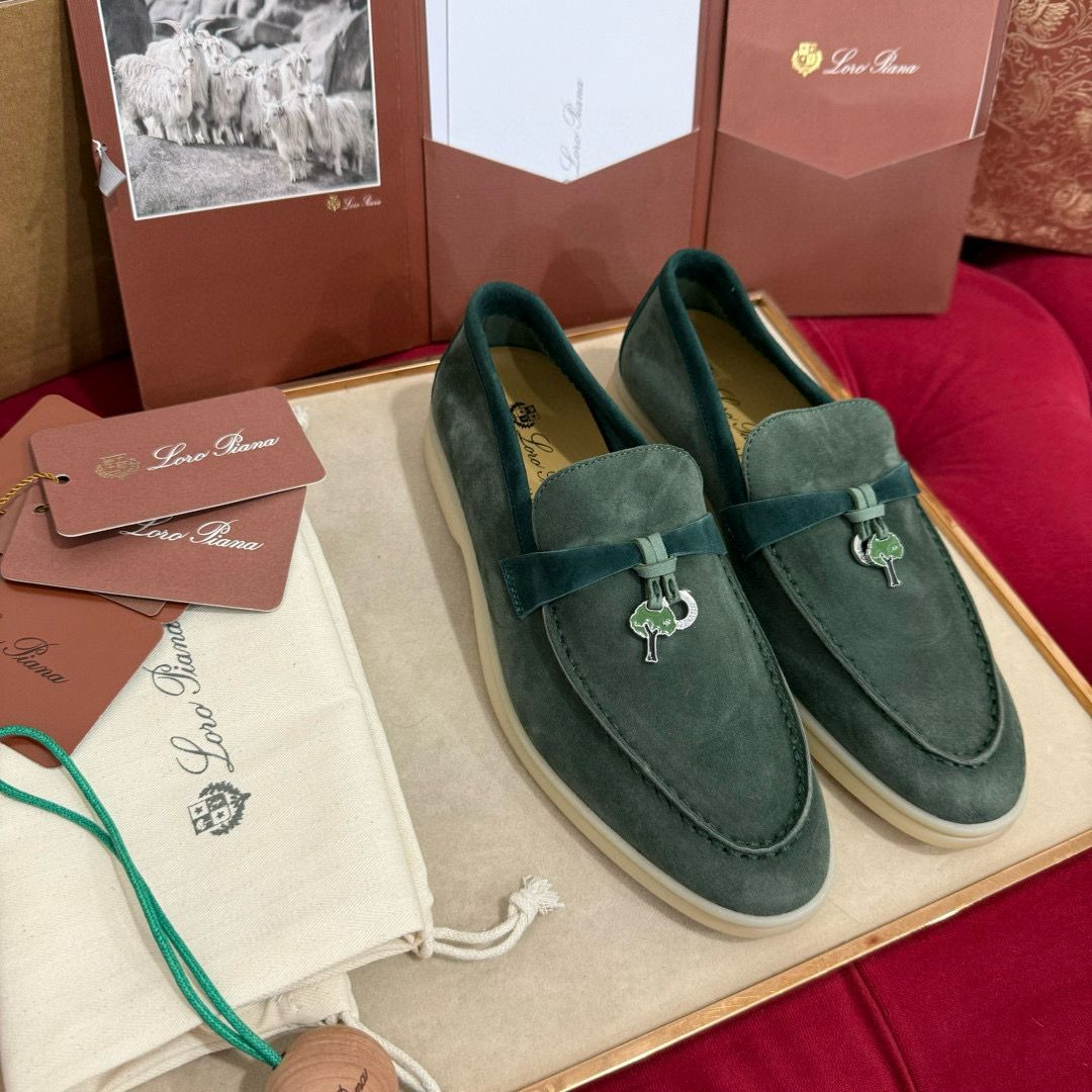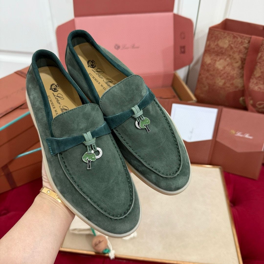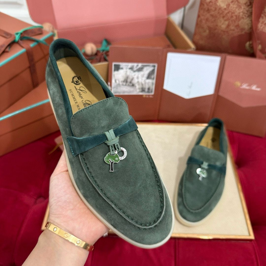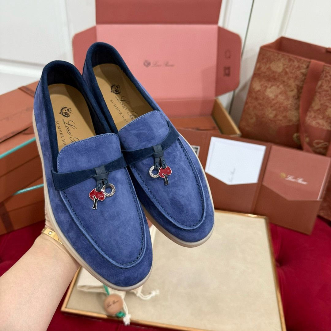 Iconic suede loafers. They feature soft nappa leather piping and suede saddles with Loro Piana My Charms.