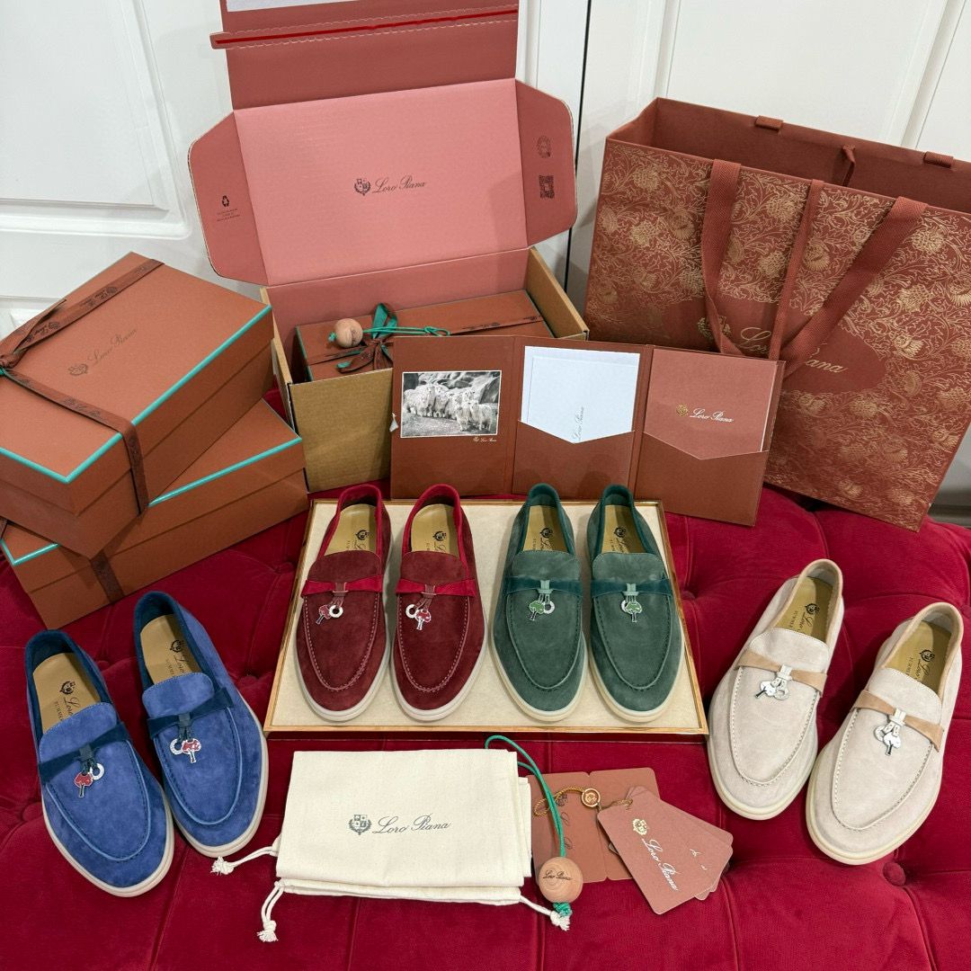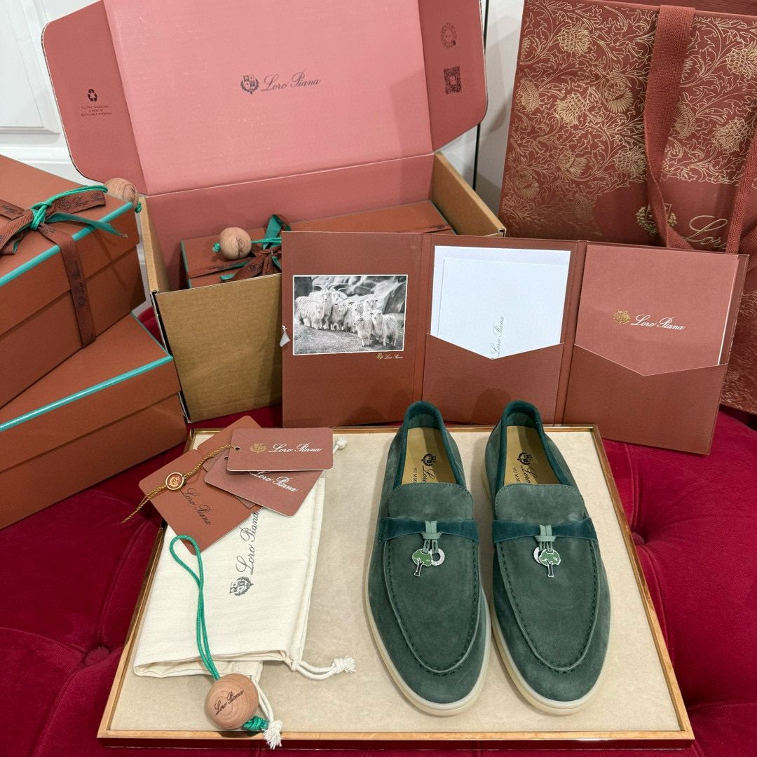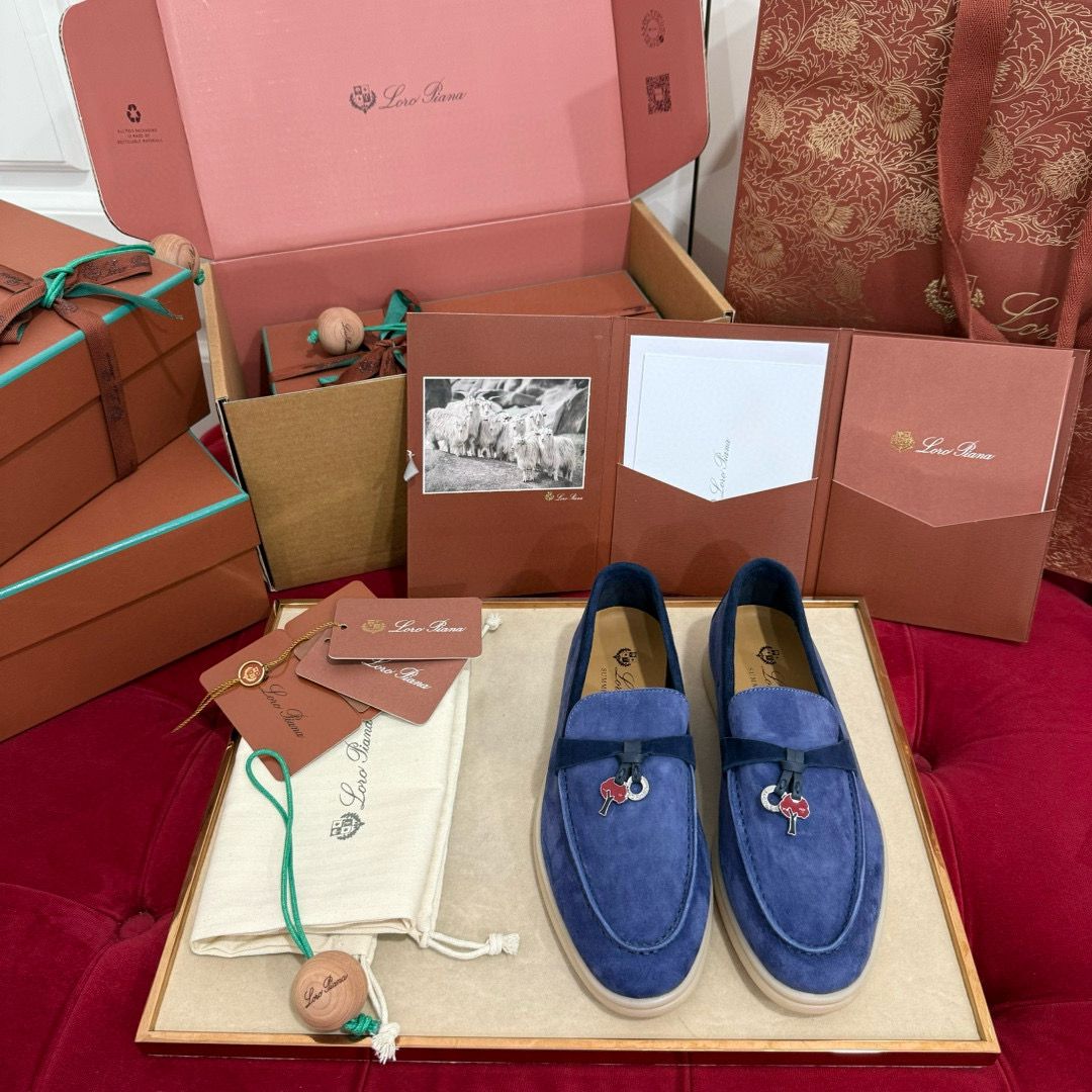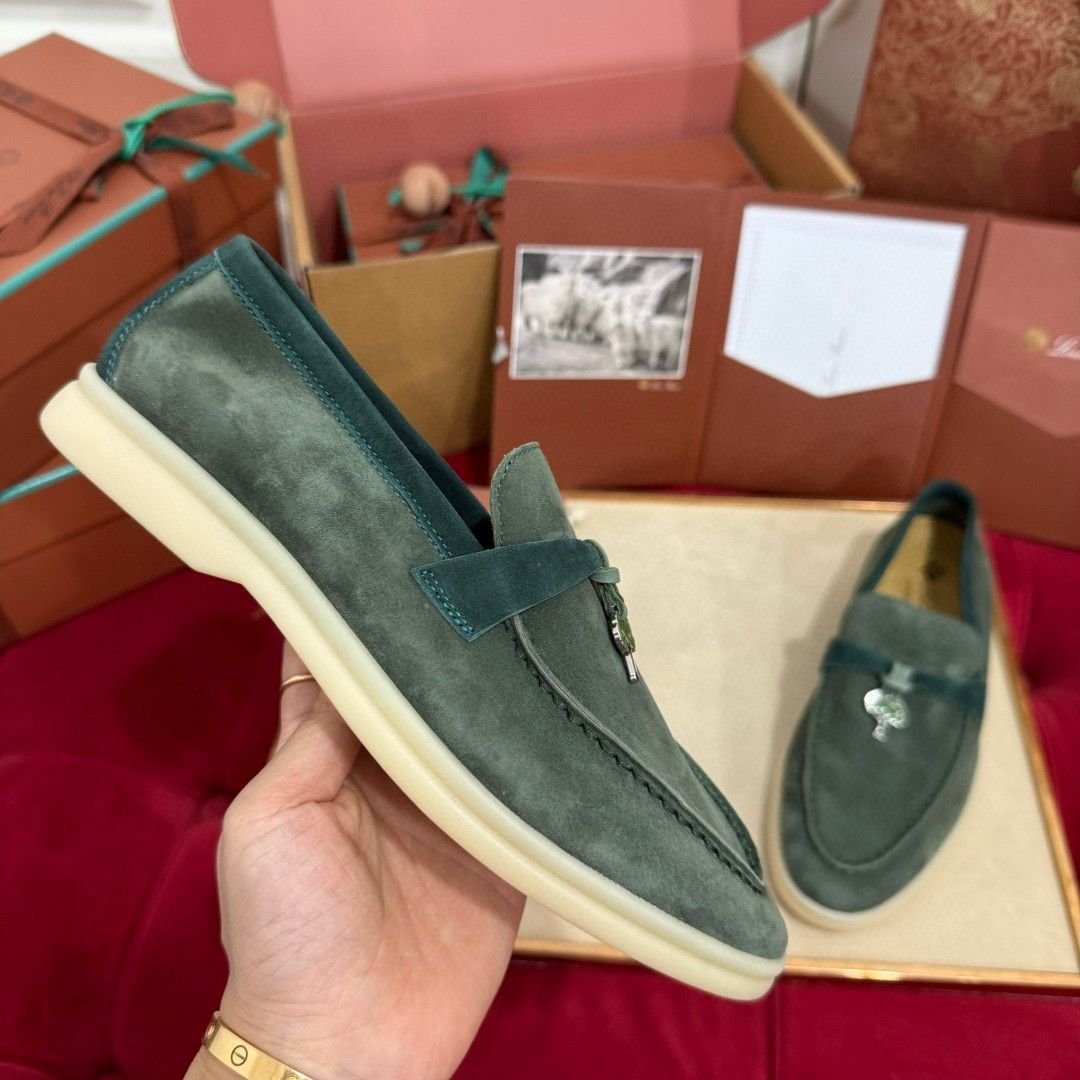 Iconic suede loafers. They feature soft nappa leather piping and suede saddles with Loro Piana My Charms.