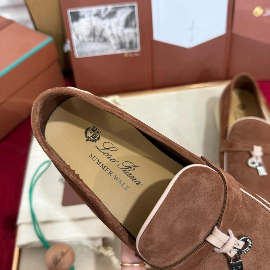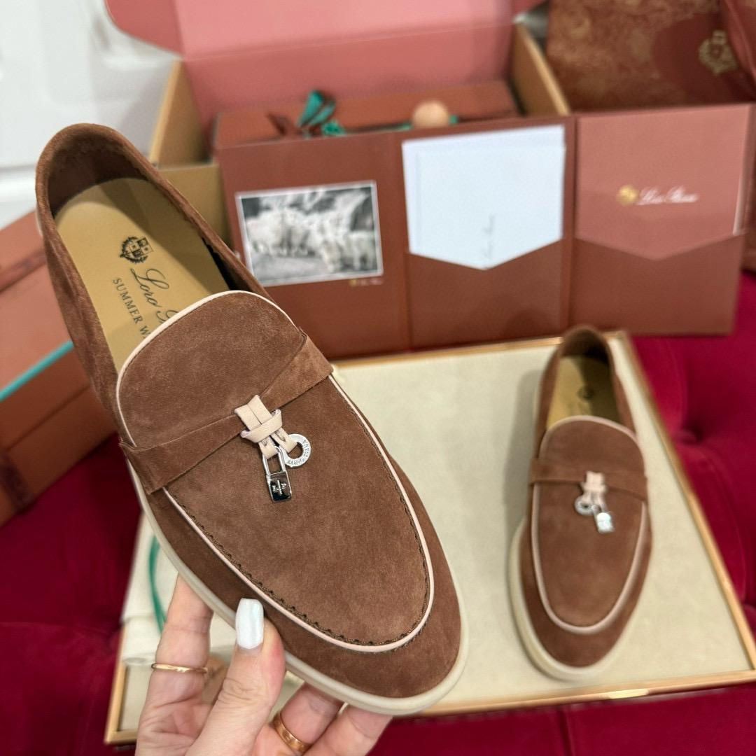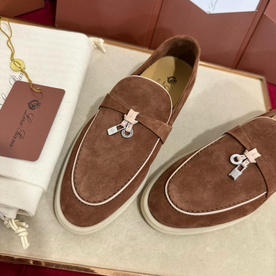 Iconic suede loafers. They feature soft nappa leather piping and suede saddles with Loro Piana My Charms.