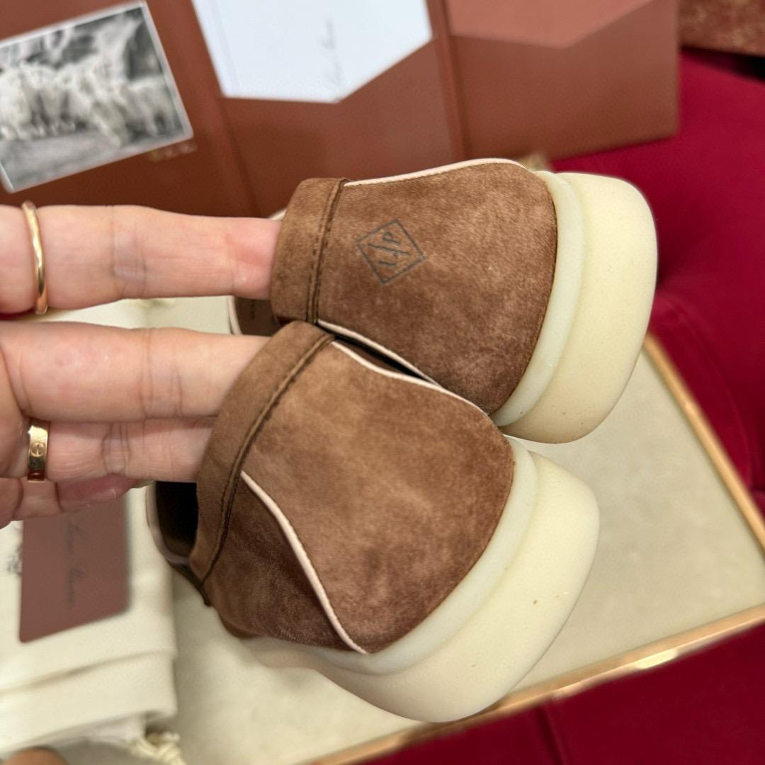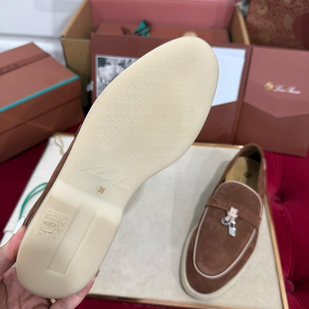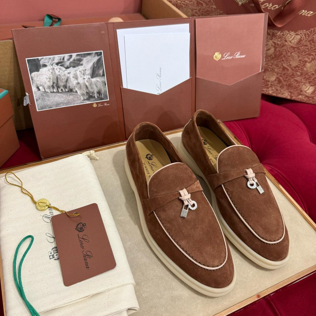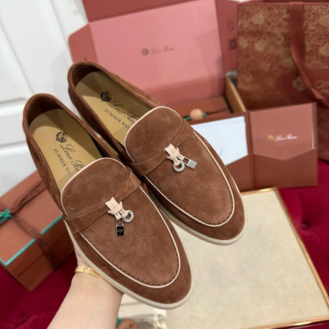 Iconic suede loafers. They feature soft nappa leather piping and suede saddles with Loro Piana My Charms.